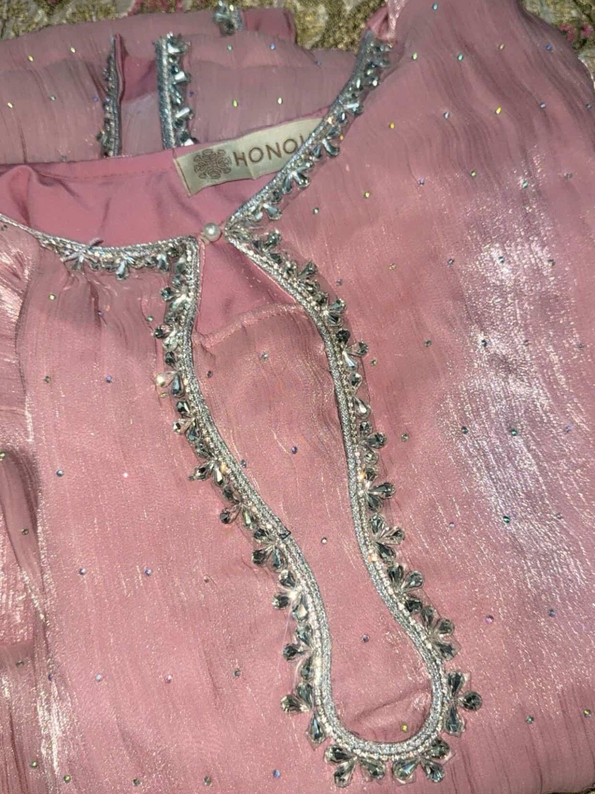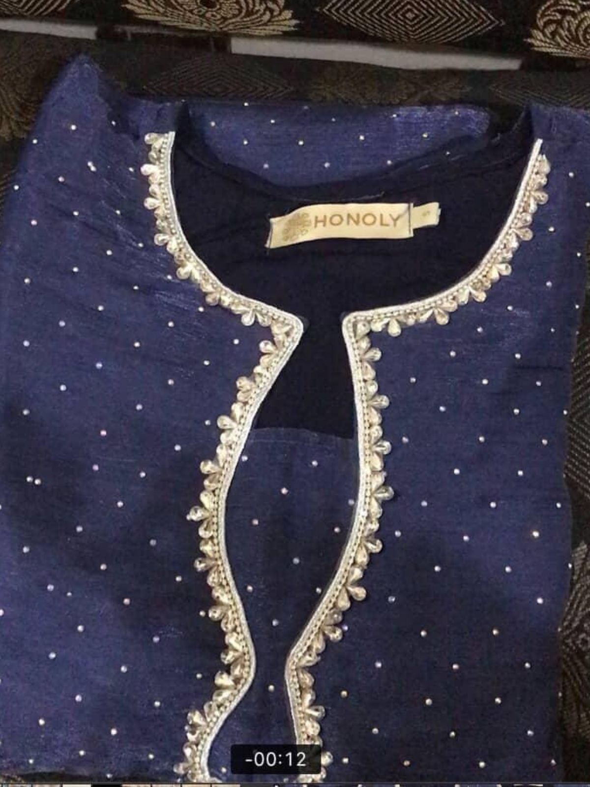 - Shirt: Lava Silk/Sheesha Silk embellished with stones and Hand Embroidered Stones Neckline, Sleeves and Slit.